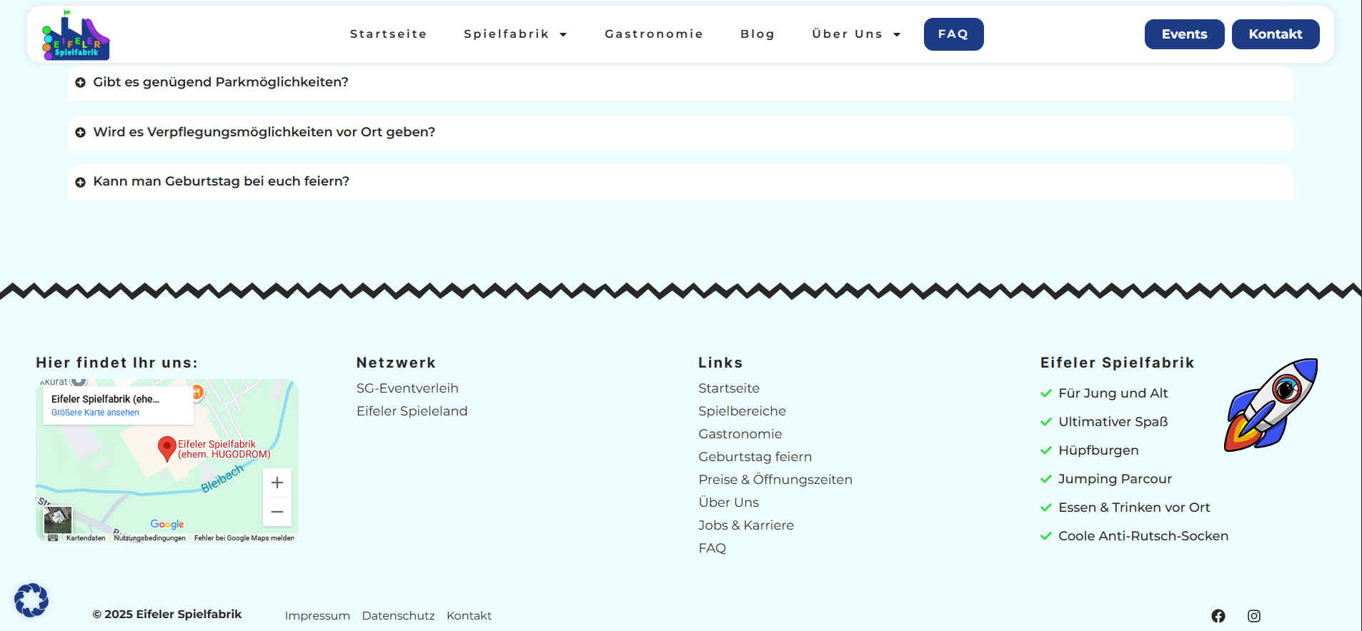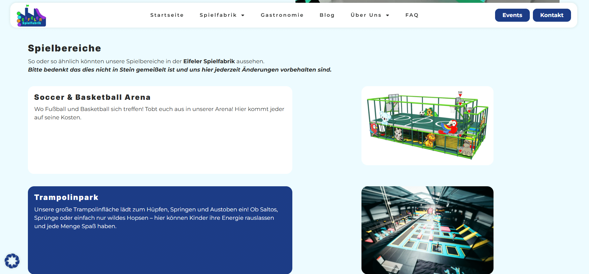Für die Eifeler Spielfabrik habe ich ein modernes und zeitloses sowie schlichtes Webdesign entwickelt. Der Indoor-Spielplatz ist speziell für Kinder ab 12 Jahren ausgelegt und deswegen musste das Design jugendlich wirken, im Gegensatz zur Partnerfirma, dem Eifeler Spieleland.